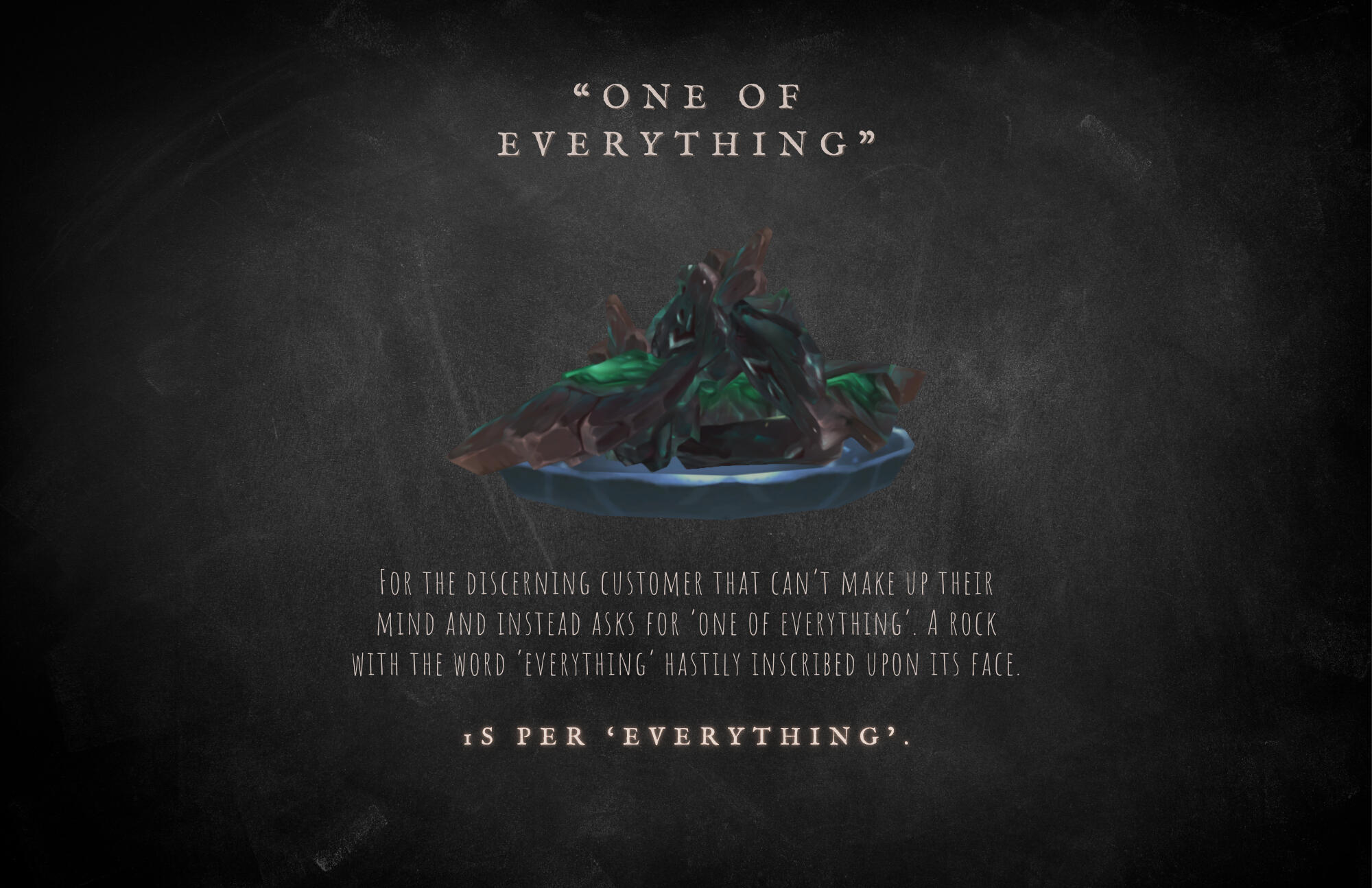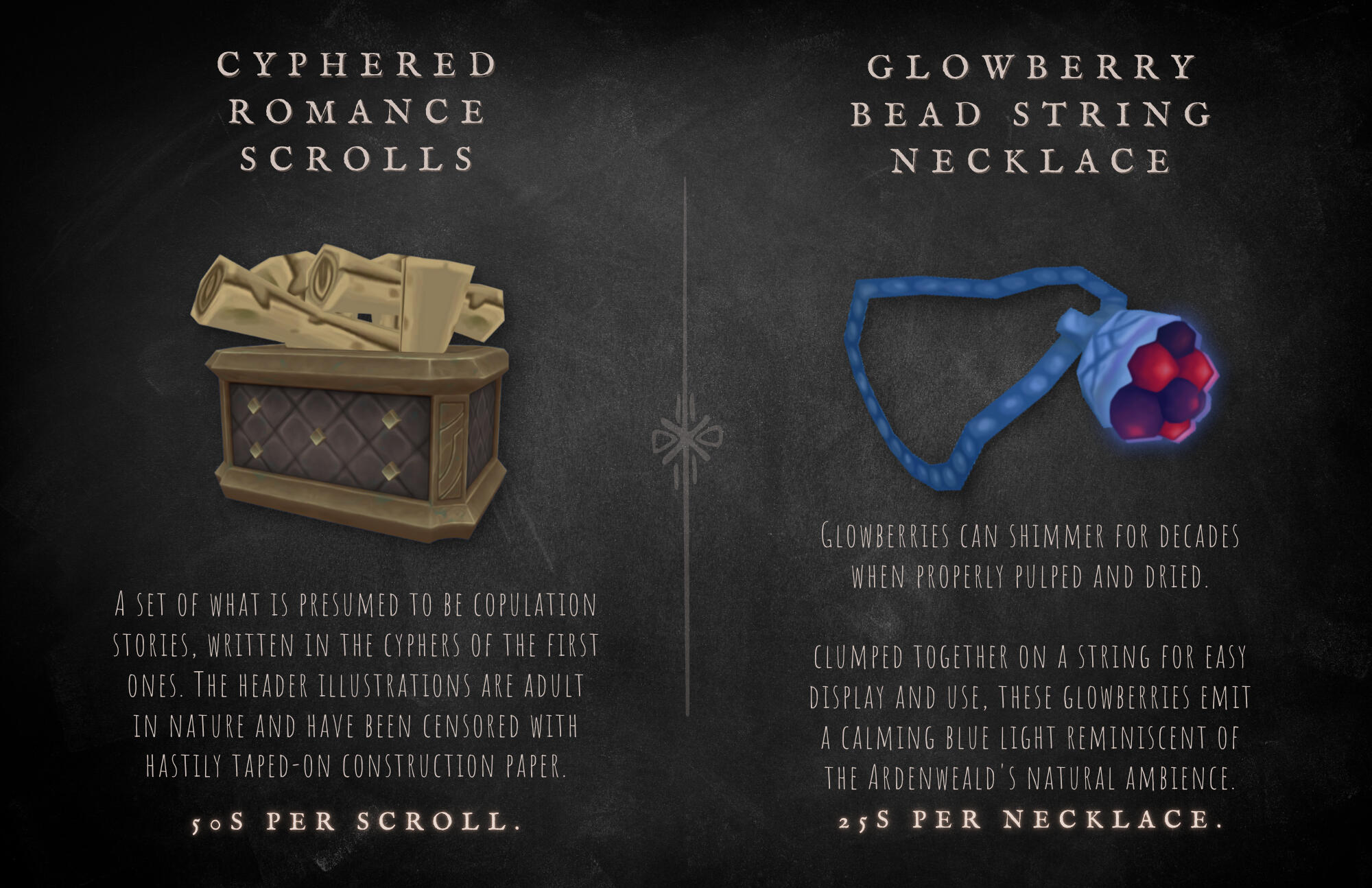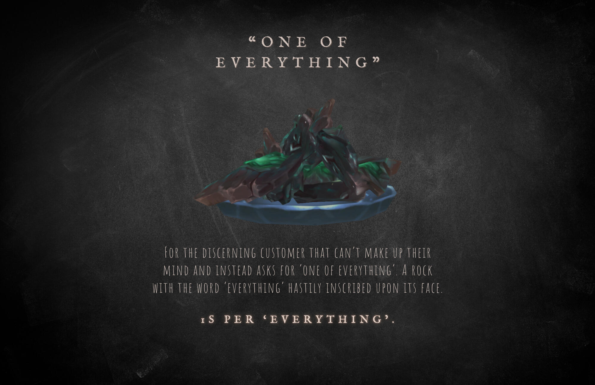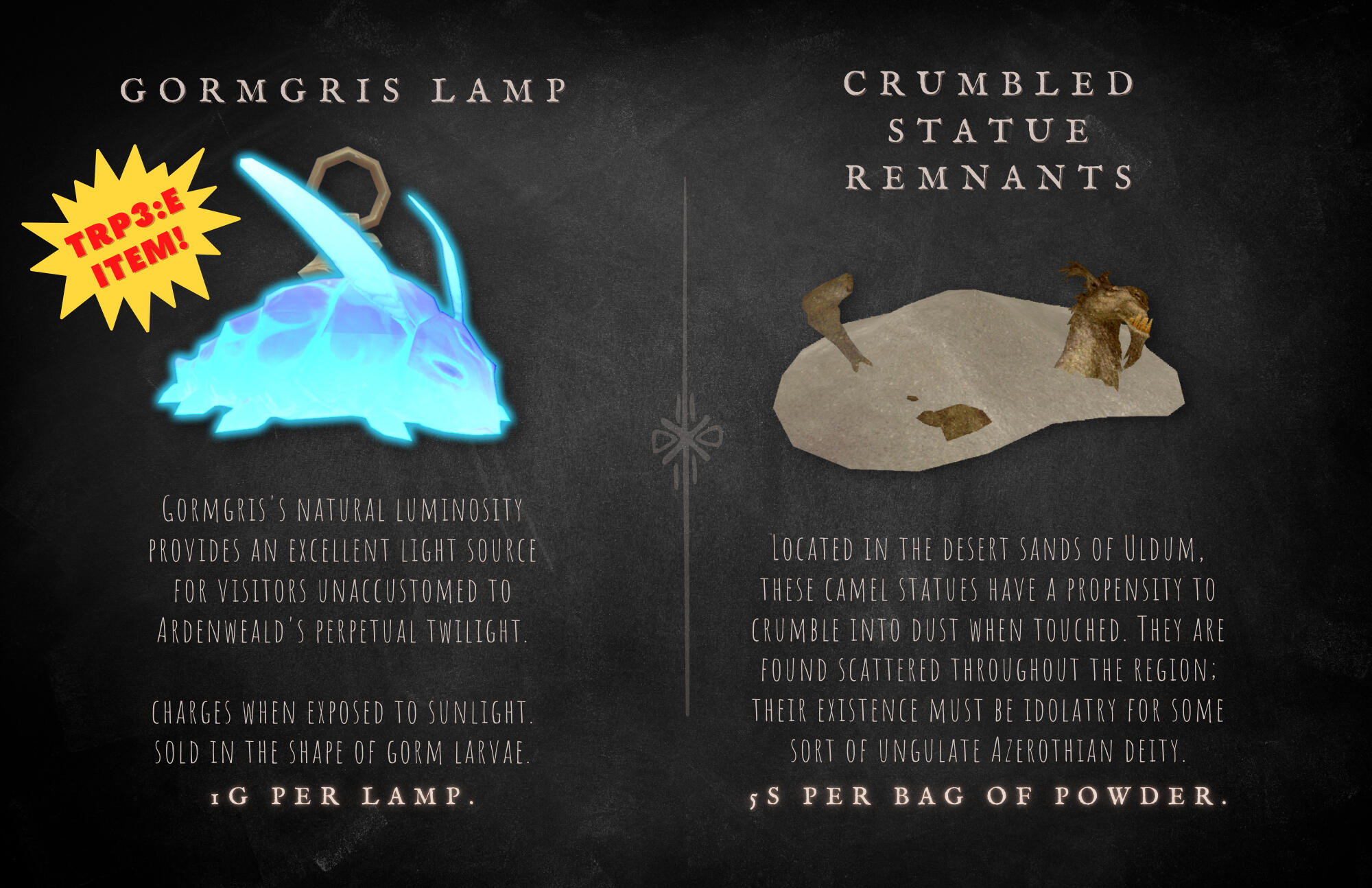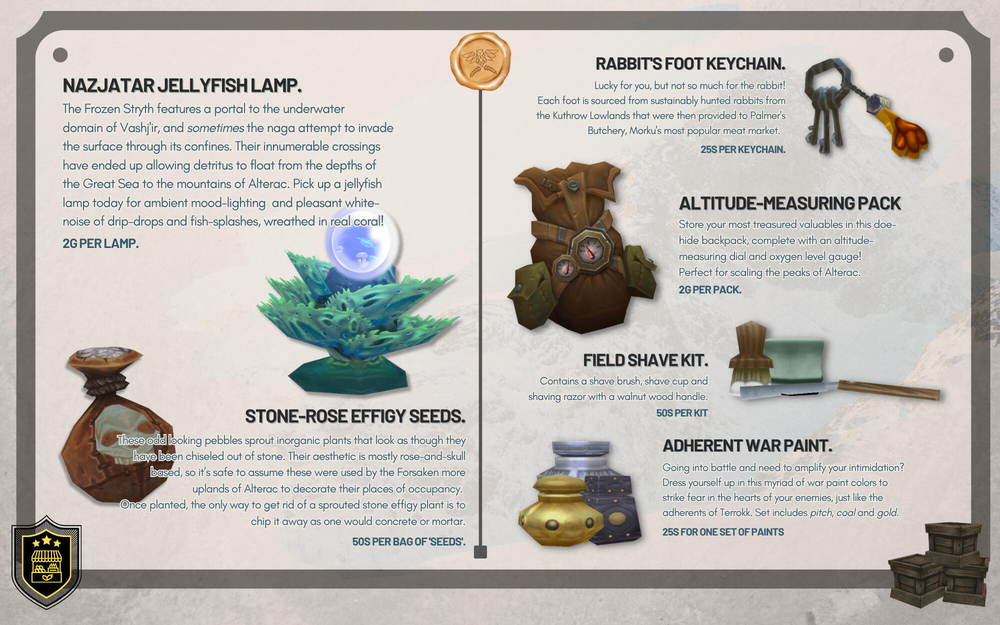 He is easily impressed by these mundane objects, and doesn't seem to understand or care for the market values of monetary currency - often trading for something of lesser value because it intrigues him, or because he's taken a liking to the customer.