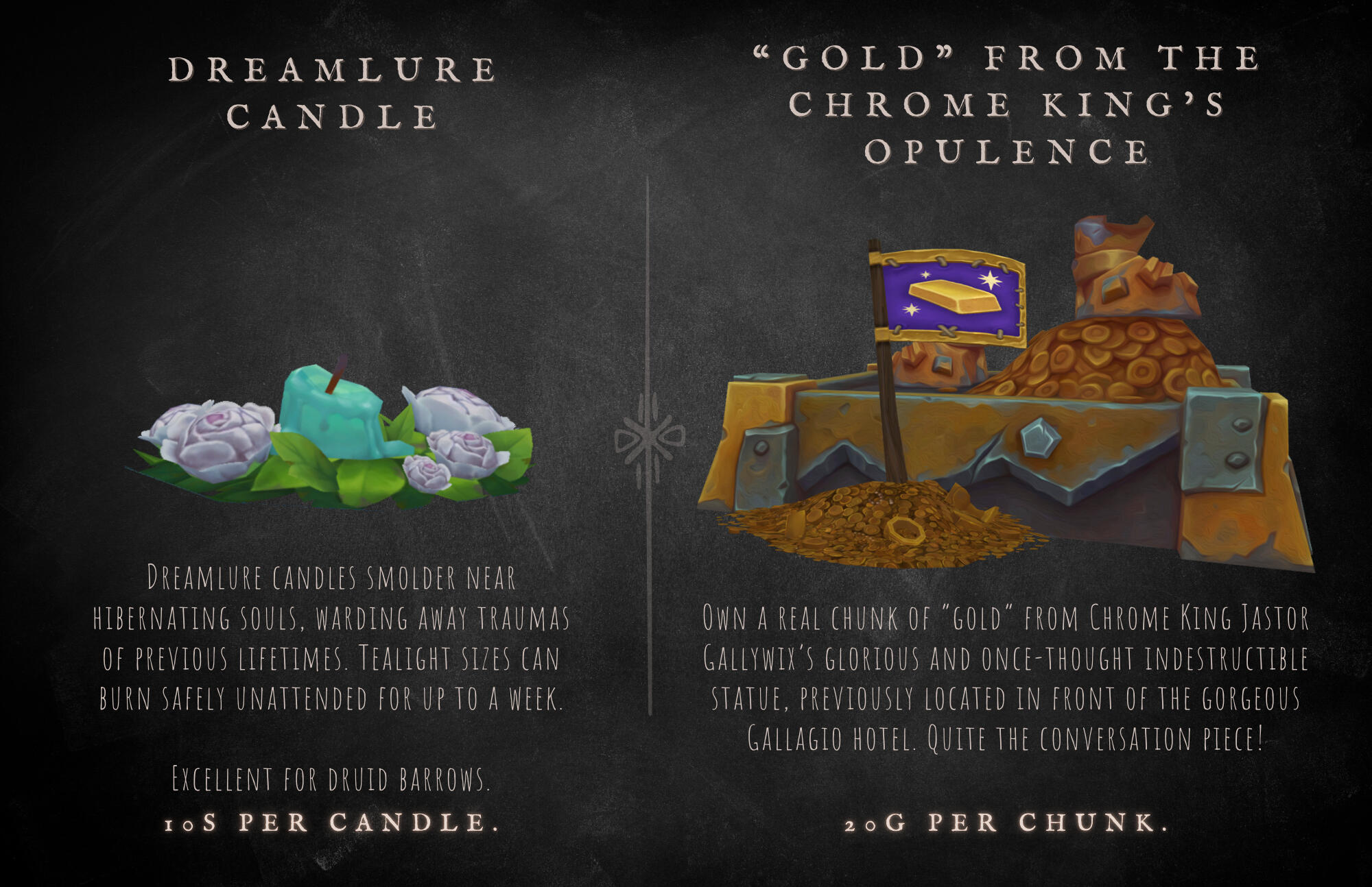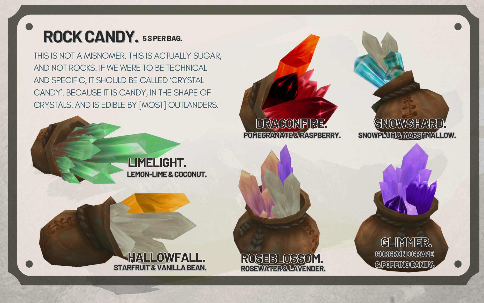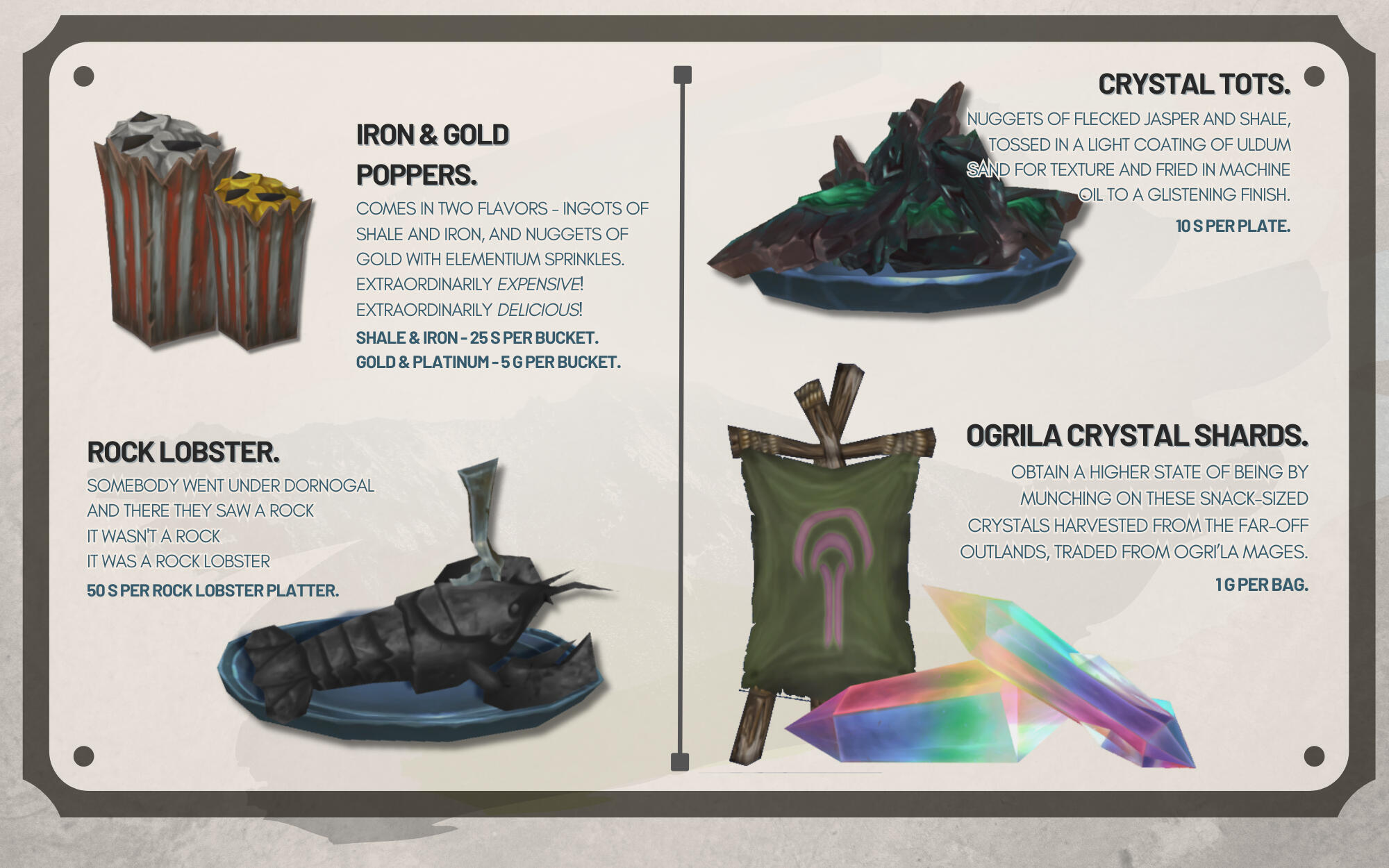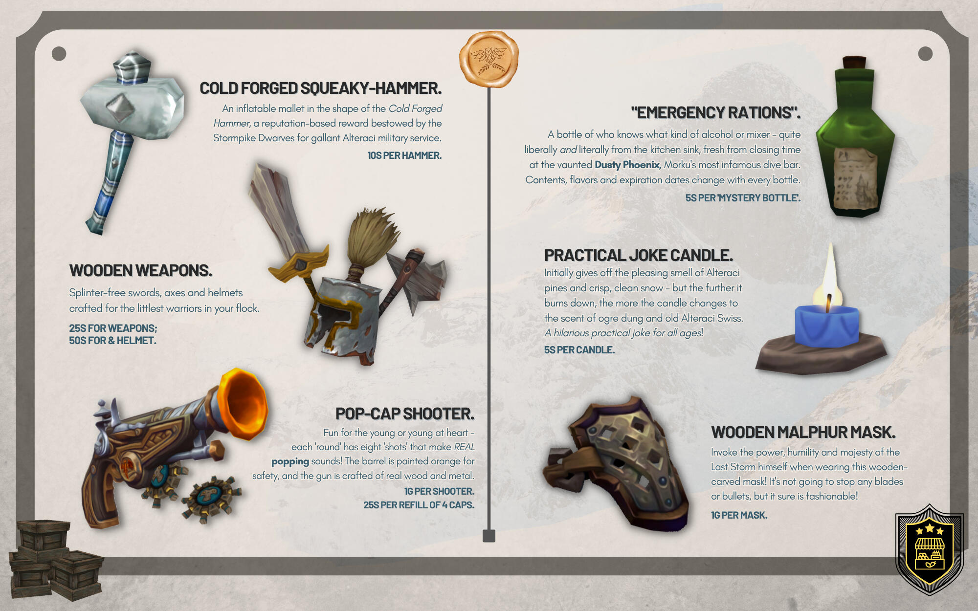 He is easily impressed by these mundane objects, and doesn't seem to understand or care for the market values of monetary currency - often trading for something of lesser value because it intrigues him, or because he's taken a liking to the customer.