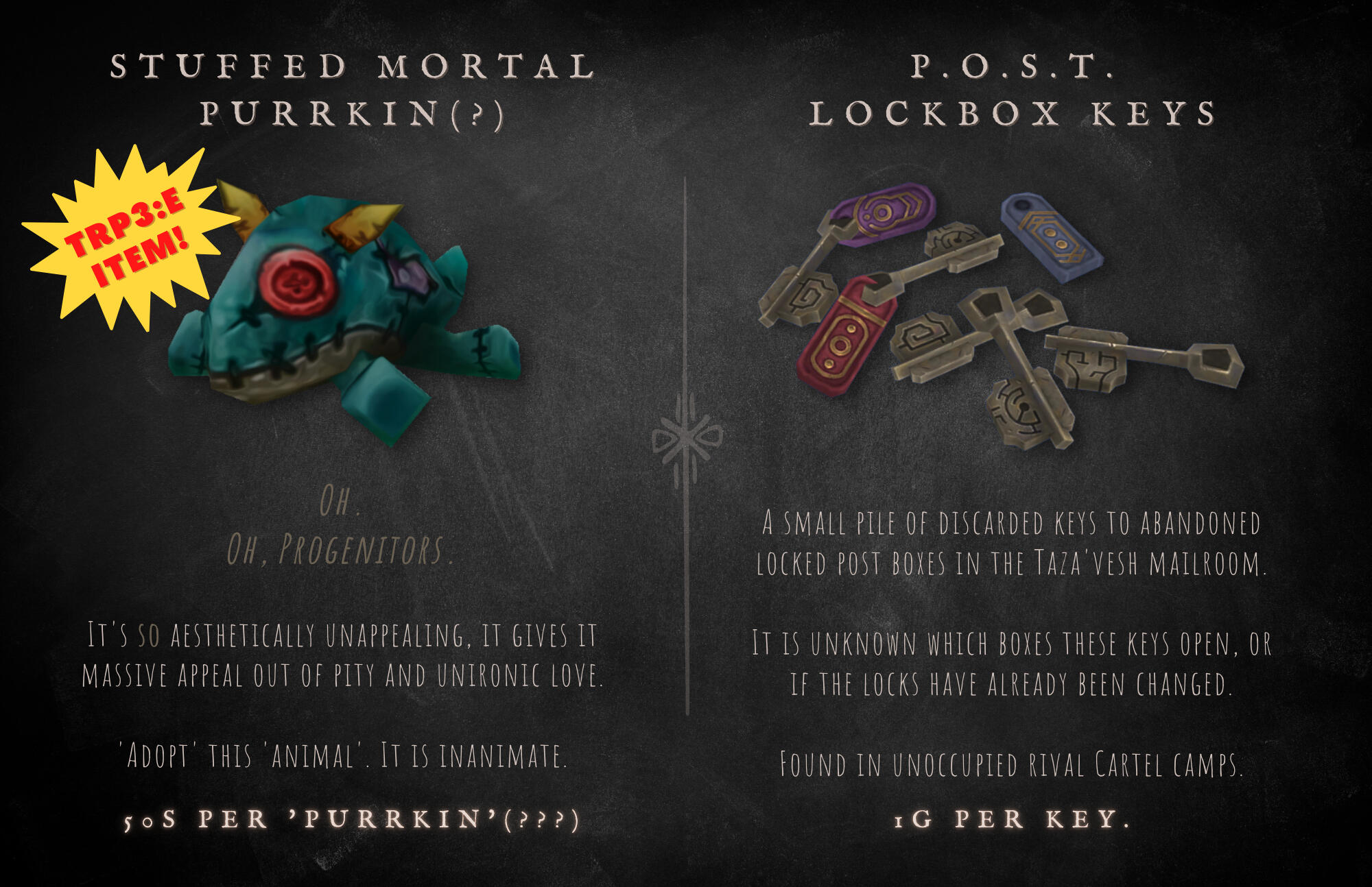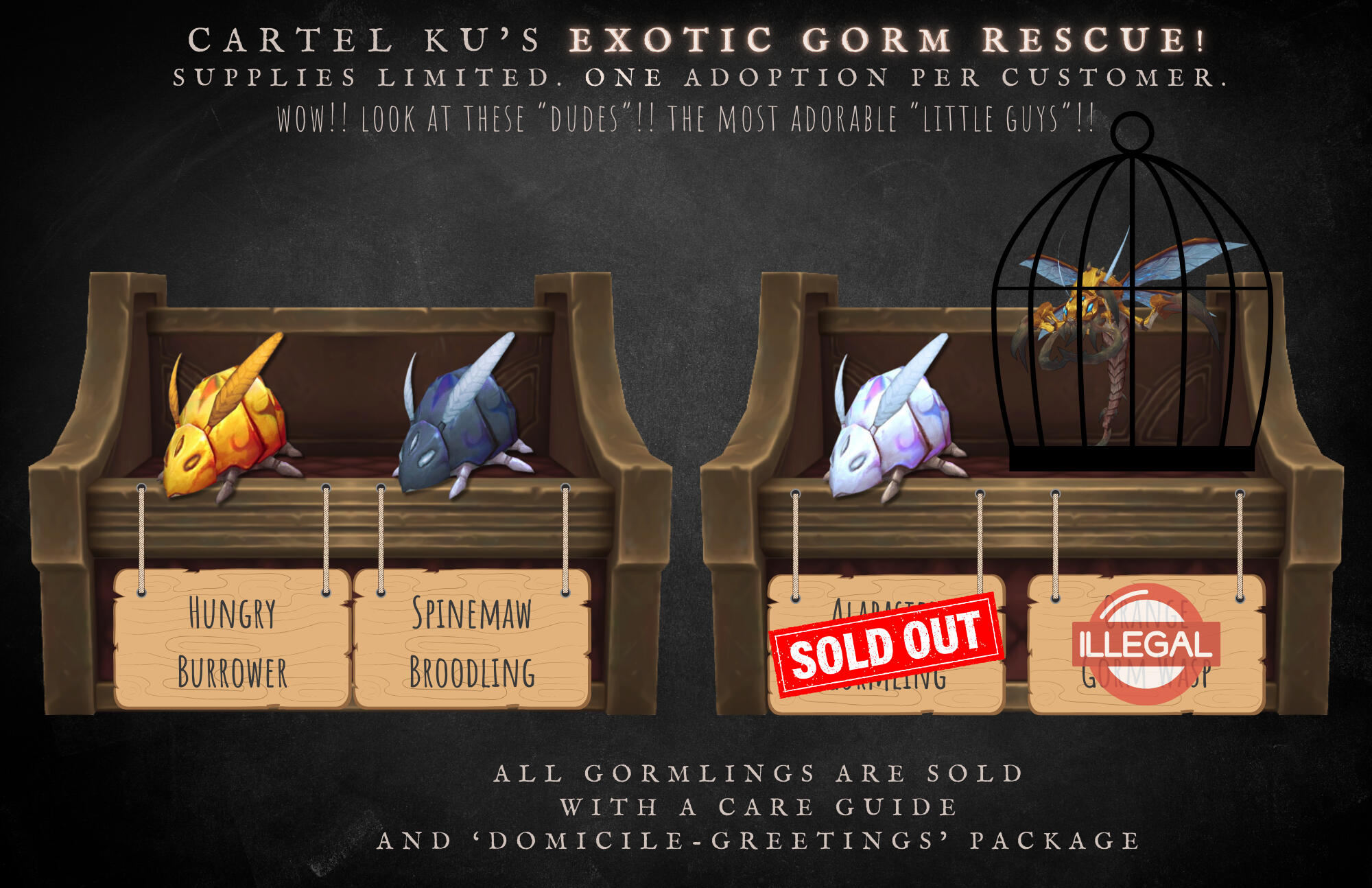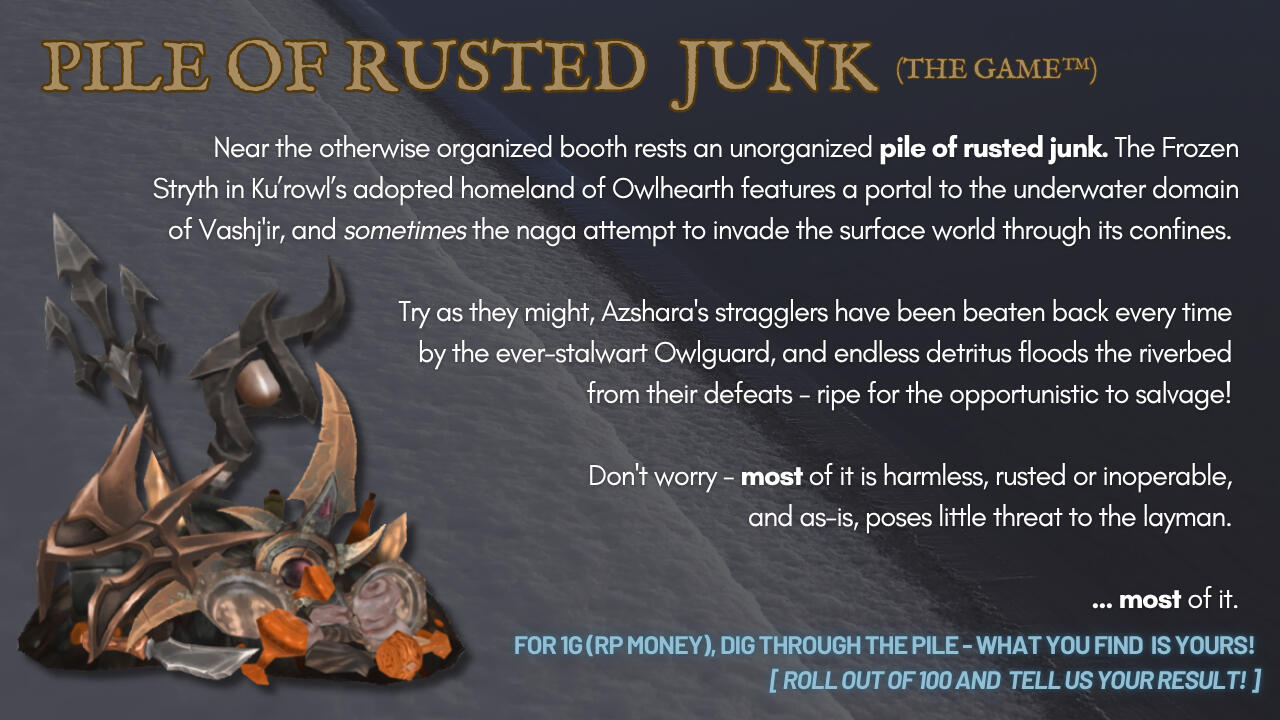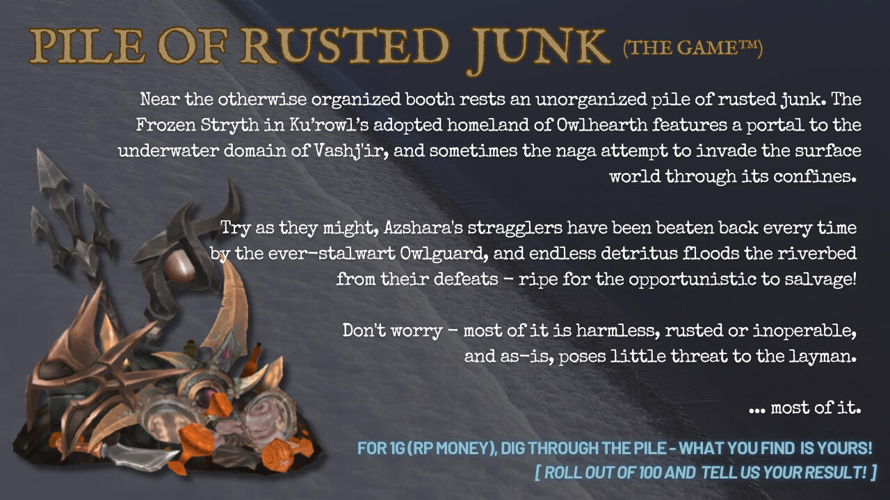 Ku'rowl maintained his presence on Azeroth via absconding to safety in varying locations from markets to landfills, scraping together a treasured grotto of 'fine wares'. He reasoned that returning to Maldraxxus was a net loss for his collection - 'hairy pustules' not commanding nearly as much of his interest as 'rubber ducks' or 'used Mechagnomish battery coils'.