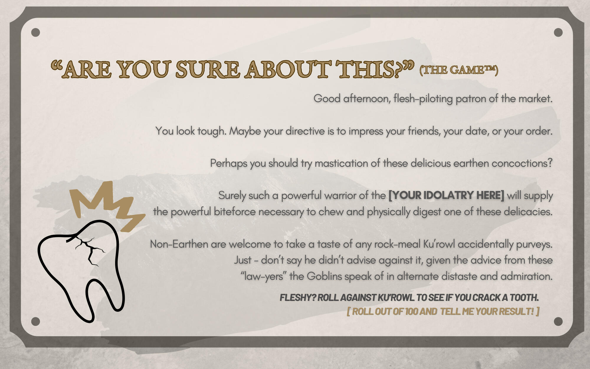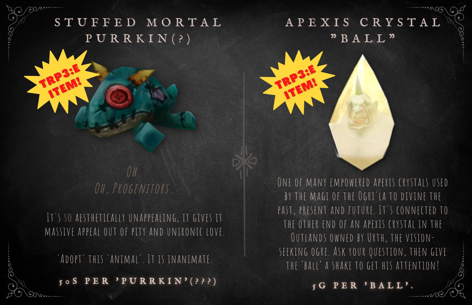 Ku'rowl is a harmless tourist to the land of the living, and often inflates and conflates his knowledge of mortal tools and implements to what he can best guess they're used for - and is, regrettably, wrong on most occasions.