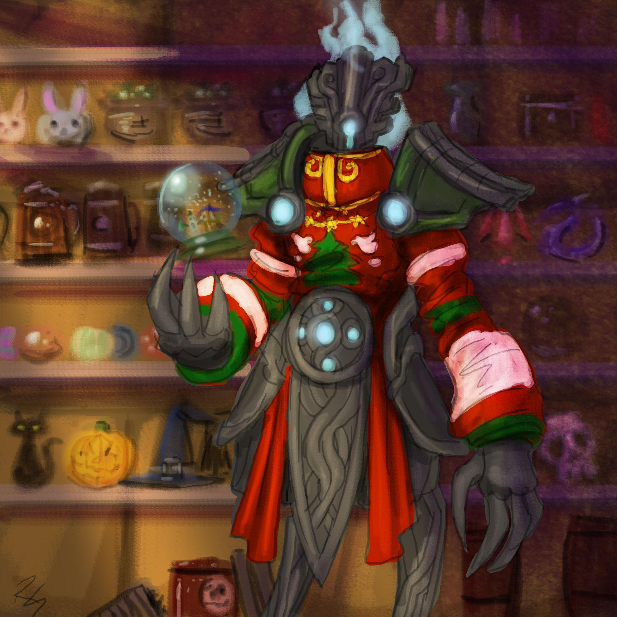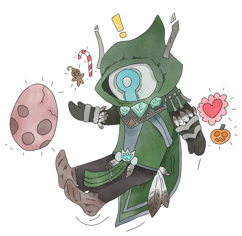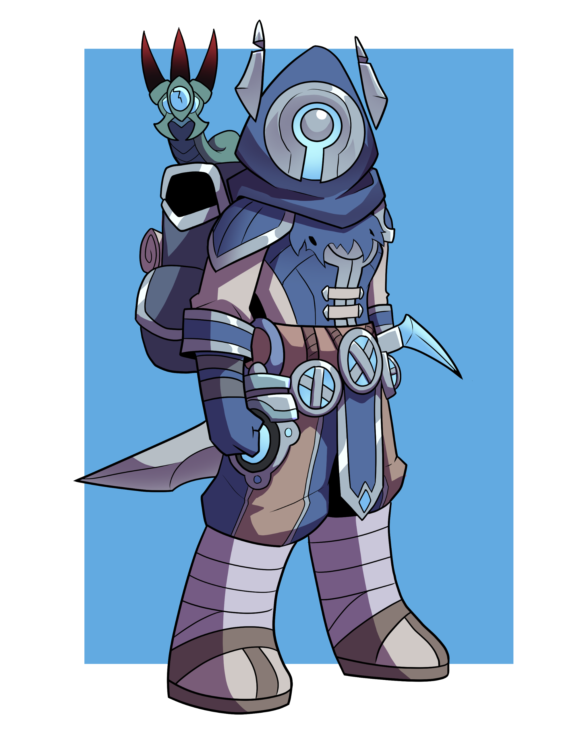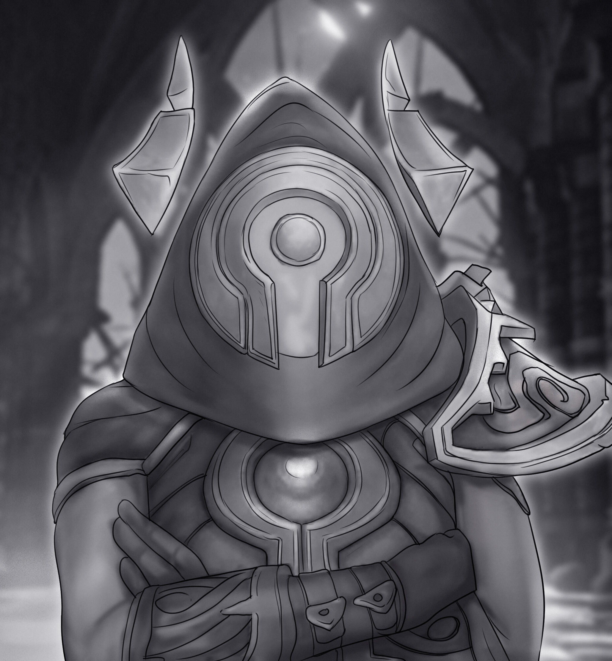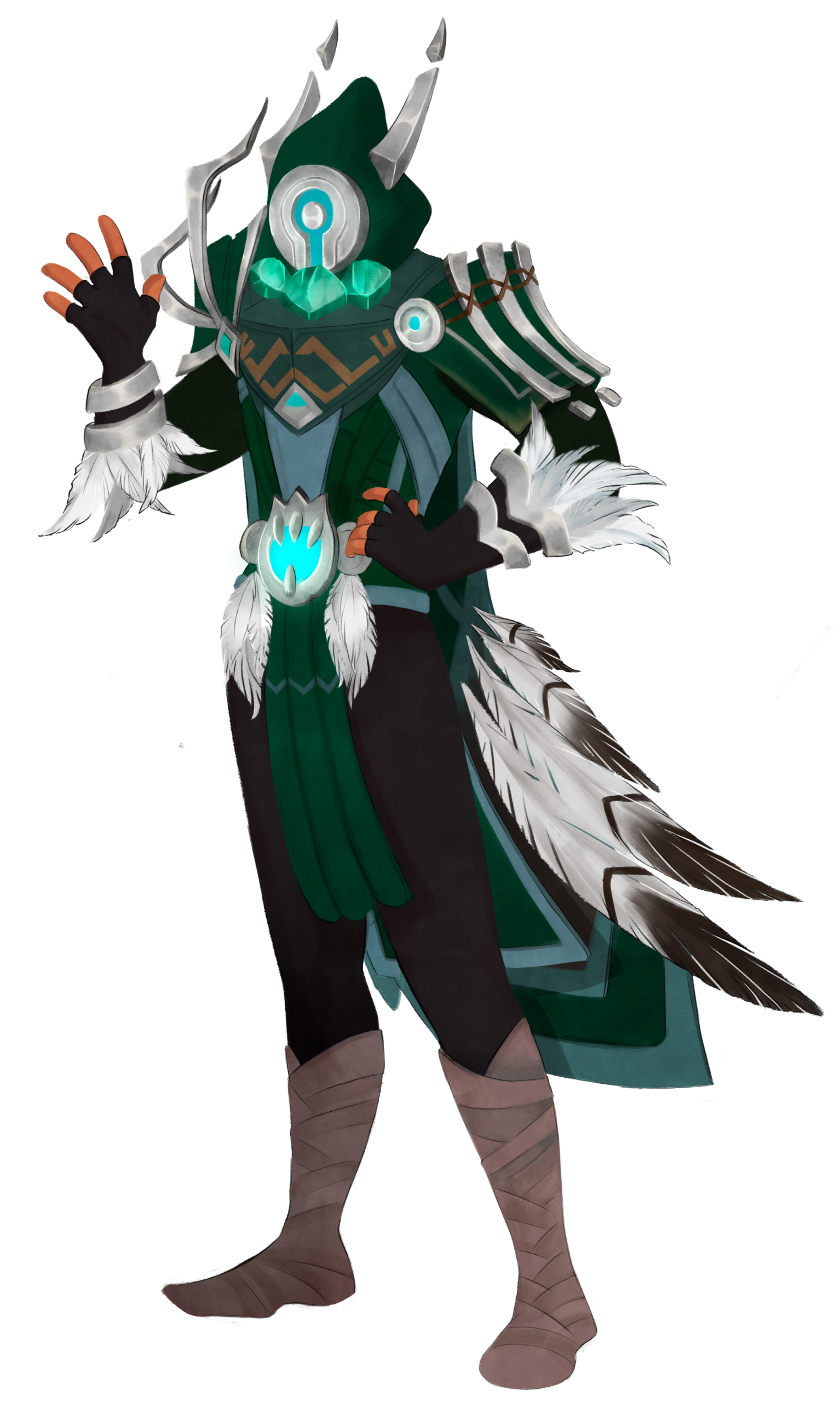 It appears whatever method Ku'rowl uses to remain anchored in the realm of the living has affected their appearance, as they do bear the typical anatomy of a Broker if one squints hard enough. Much like their kin in the Shadowlands, Ku'rowl stands Quite Tall, with wrapped metallic limbs and somewhat elongated, curiously-engraved phlanges. They have no discernable facial features when viewed from a profile, and if their hood was somehow removed and the dinner-plate covering of their mask was taken off, it'd reveal teal flames and naught else.